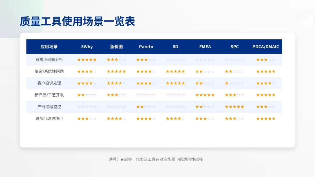 P5:质量工具使用场景一览表(清晰表格) 不同场景推荐不同工具: