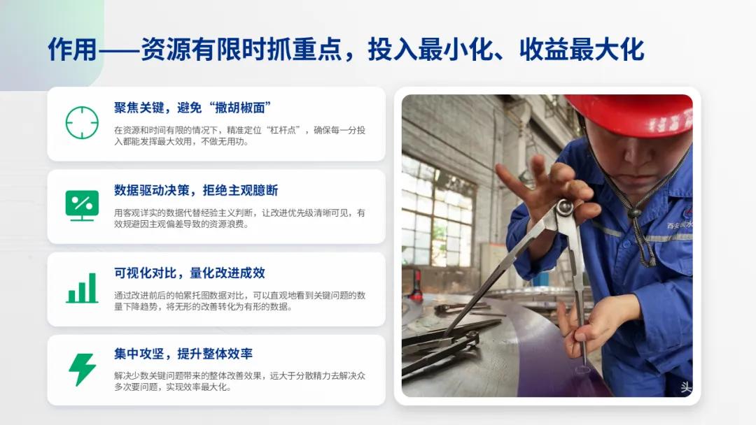 P17:作用与重要性: 在资源有限的情况下帮助我们“抓重点、打七寸”,用最小投入获得最大质量改善收益,是数据驱动决策的利器。