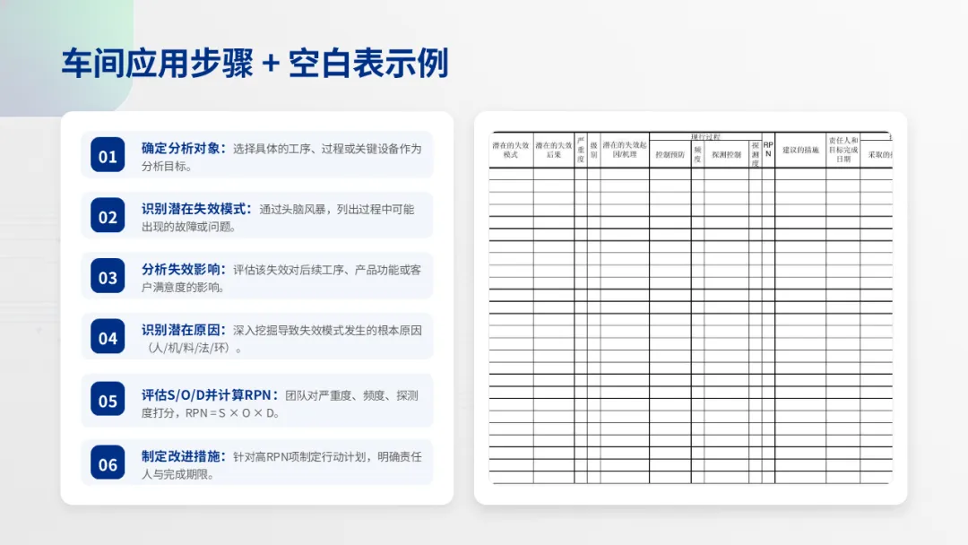 P22-25:FMEA第22页第五个工具:FMEA(失效模式与影响分析)。 提前识别潜在失效模式,并通过RPN(严重度×发生率×探测度)计算风险优先级。