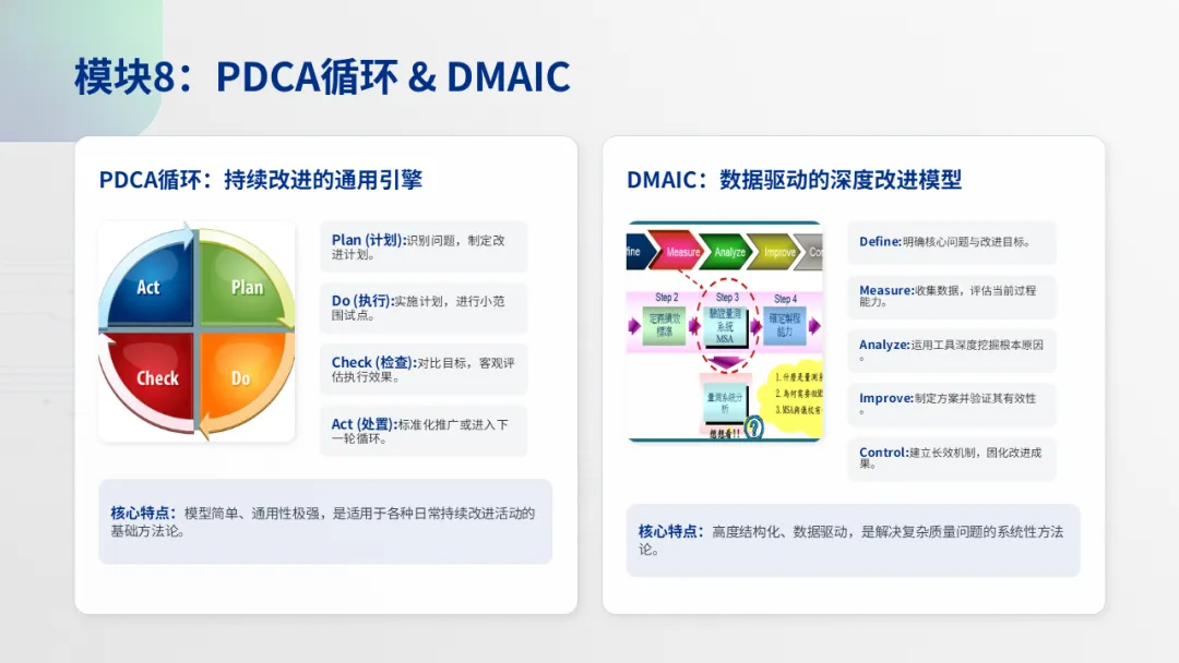 P31:PDCA四步:Plan计划 → Do执行 → Check检查 → Act行动;DMAIC更精细Define-Measure-Analyze-Improve-Control)。