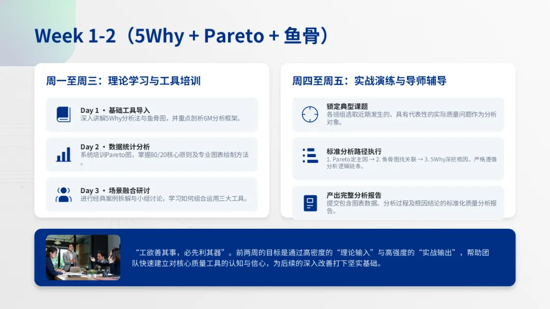 P34-35:Week 1-2:全员培训5Why + Pareto + 鱼骨图,每天练1个真实问题 Week 3-4:8D + FMEA + SPC在1条产线试点