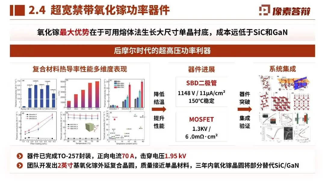 - 氧化镓等超宽禁带材料从实验室走向产业,PFOM 和击穿电压不断刷新纪录,实现万片级量产能力,成本大幅降低。