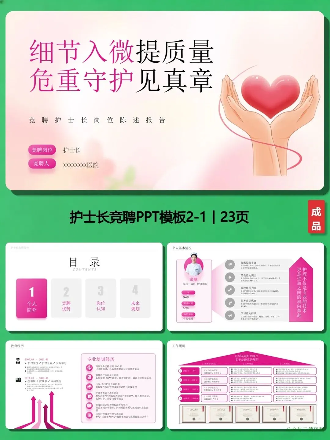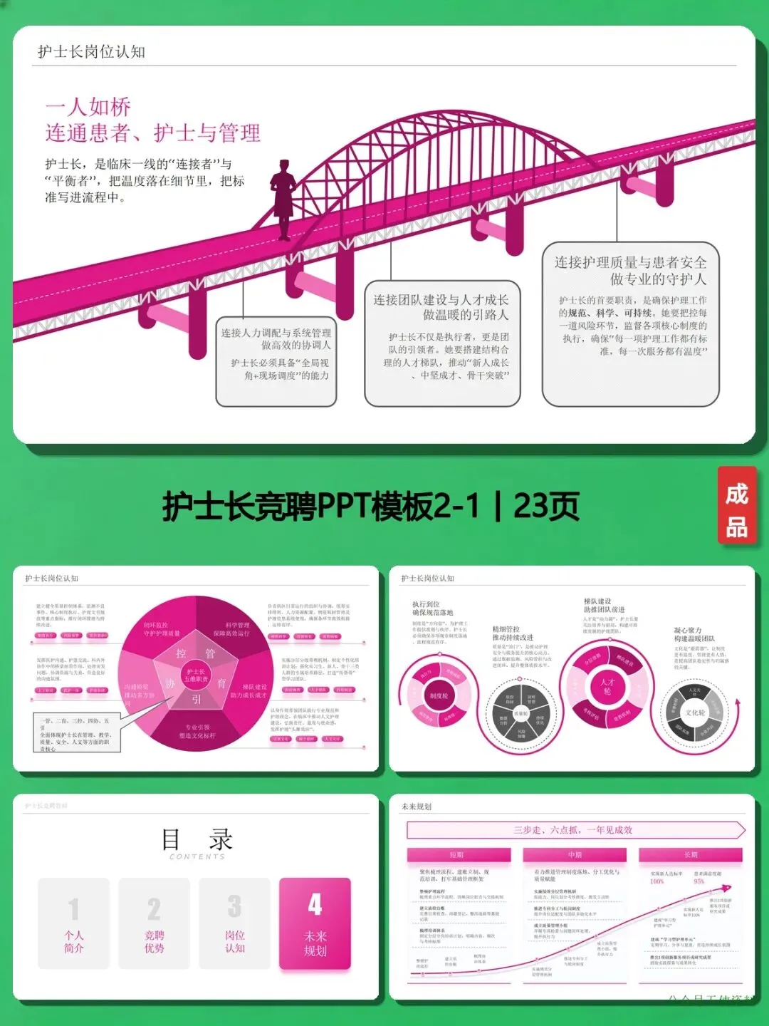 为什么强烈推荐这份PPT?因为它把“竞聘逻辑”玩明白了:✅ 结构清晰到“傻瓜式”:个人简介→竞聘优势→岗位认知→工作规划,四个模块环环相扣,从“我是谁”到“我能做什么”再到“我会怎么做”,评委看完一目了然;✅ 数据说话不“空喊口号”:比如“带教80+新护士,通过率100%”“主导压疮防控项目,发生率从0.6%降至0.2%”“推动物资浪费率低于2%”,这些硬数据比“我工作认真负责”管用100倍;✅ 岗位认知“戳中评委心”:把护士长定位成“临床护理系统工程师”,既要管人员、流程、服务,也要控风险、抓培训,这种专业的理解,瞬间拉开和其他竞聘者的差距;✅ 工作规划“落地不画饼”:短期目标梳理8项核心制度,中期目标推进智慧护理项目,长期目标把护士离职率控制在5%以内,每个阶段都有具体动作,让评委相信你“说到做到”。