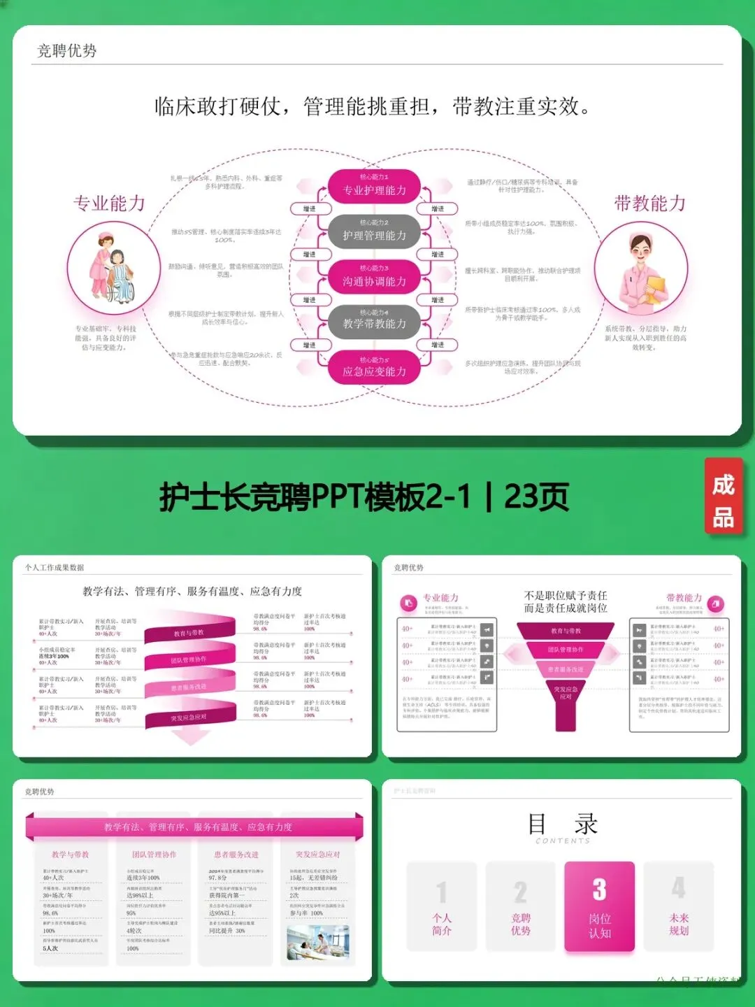 很多护士姐妹跟我吐槽:“准备护士长竞聘PPT,熬了3夜还是一团糟,不知道怎么突出自己的优势,也不知道岗位认知该怎么写。”其实,竞聘PPT的核心不是“炫技”,而是“精准展示”——让评委一眼看到你的能力、潜力和规划。
