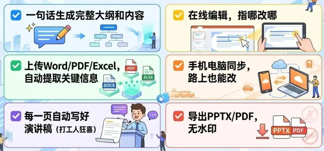 脑子里想得明明白白,打开PPT却对着空白页面发呆半小时?调个对齐能折腾十几分钟,换个字体发现全乱了。好不容易做完,领导扫了一眼说“再改改”,你连他想要什么方向都不知道。
