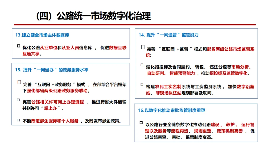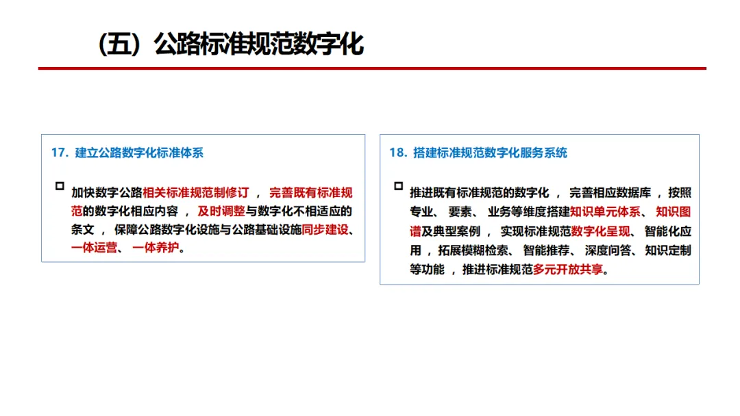 方案明确智慧公路的核心是“软联通”,以数字化底座为基础,以智慧建造、智慧养护、智慧管理、智慧服务为四大支柱,以数据赋能、网络运营、创新驱动、价值导向为四大支撑,实现公路从物理连通向数字协同升级。顶层设计遵循“1156”总体思路,围绕五大专项行动、六大成果推进公路数字化转型,覆盖设计施工、在役管控、路网服务、市场治理、标准规范、基础保障六大领域,依托BIM、GIS、物联网、北斗、5G、数字孪生等技术,打造全要素感知、全业务协同、全生命周期管理的智慧公路体系。