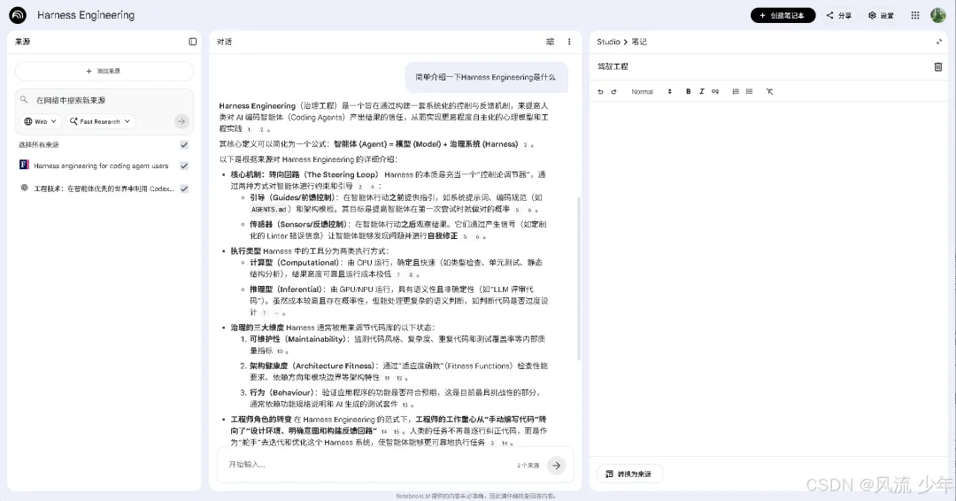 你有没有遇到过这种情况:收集了一堆PDF、网页、论文,但根本没时间一个个去读?NotebookLM就是为了解决这个问题而生的。NotebookLM 是 Google 推出的一款AI笔记与研究工具,底层由 Gemini 大模型驱动。它的核心逻辑很简单:**你上传资料 → AI帮你读完 → 你向AI提问 → AI基于你的资料回答(并标注出处) **和 ChatGPT 最大的区别在于:NotebookLM 不联网、不编造,所有回答都严格基于你上传的资料,每个结论都能溯源到具体段落。这对于做研究、写报告、准备考试来说,非常靠谱。