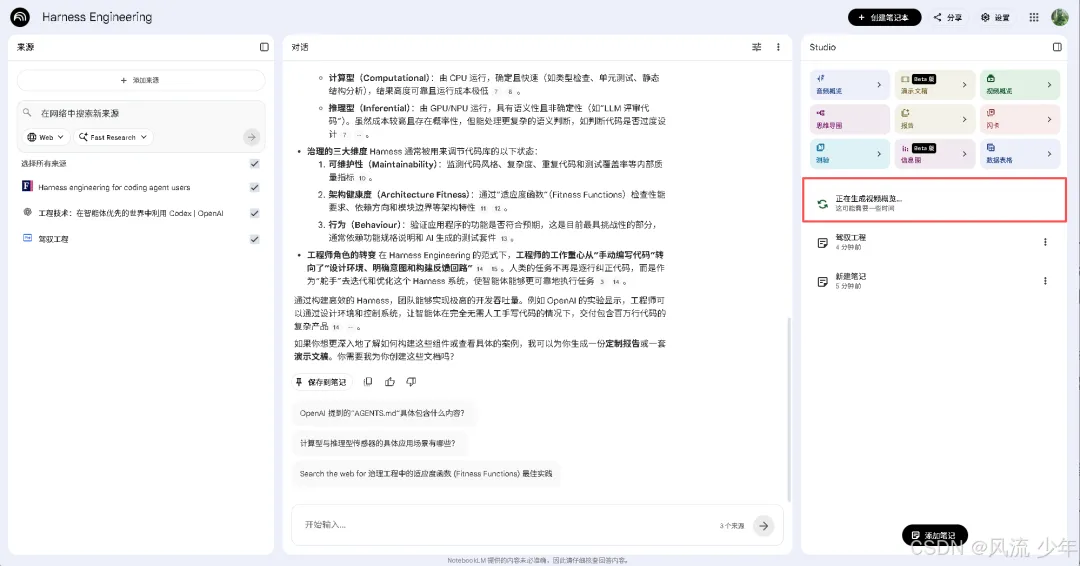 这是NotebookLM最出圈的功能,也是它和其他AI工具拉开差距的地方。NotebookLM会把你上传的资料自动生成一段5~15分钟的播客音频。两个AI主持人会以轻松对话的形式,讨论你的资料内容——就像你在听两个专家聊你关心的话题。