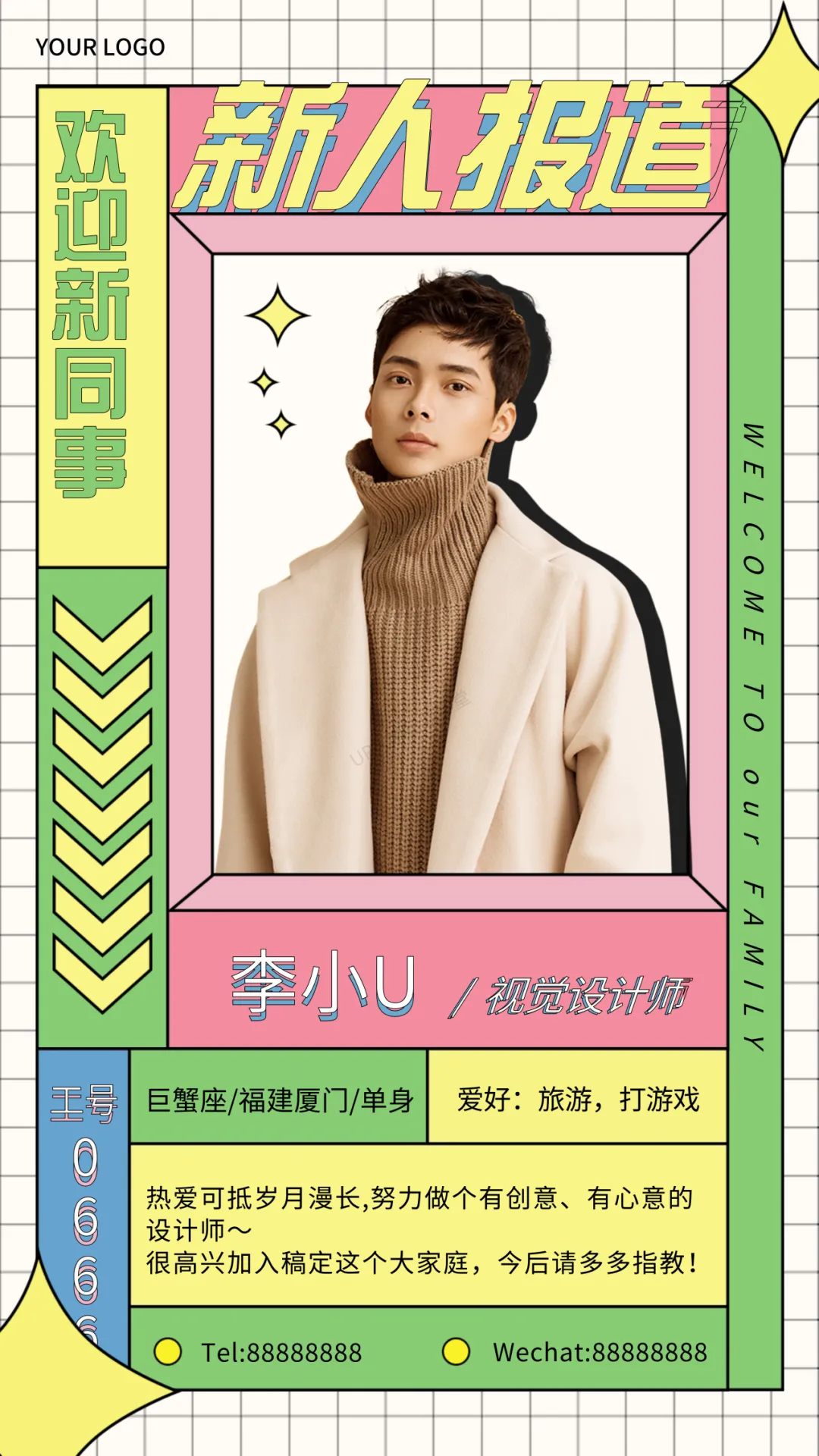 《新人介绍海报》资料包内含29份不同类型的新人入职介绍海报模板,设计精美,PPT格式,文字改改就能用上了。