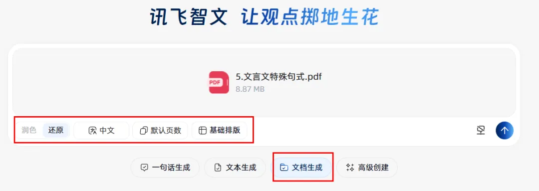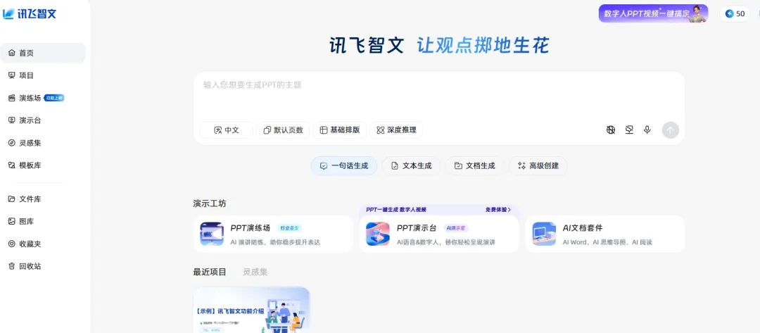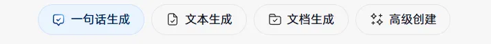 如上图所示,讯飞智文有四种创作方式:一句话生成、文本生成、文档生成、高级创建,大家可根据自己的需求进行选择。