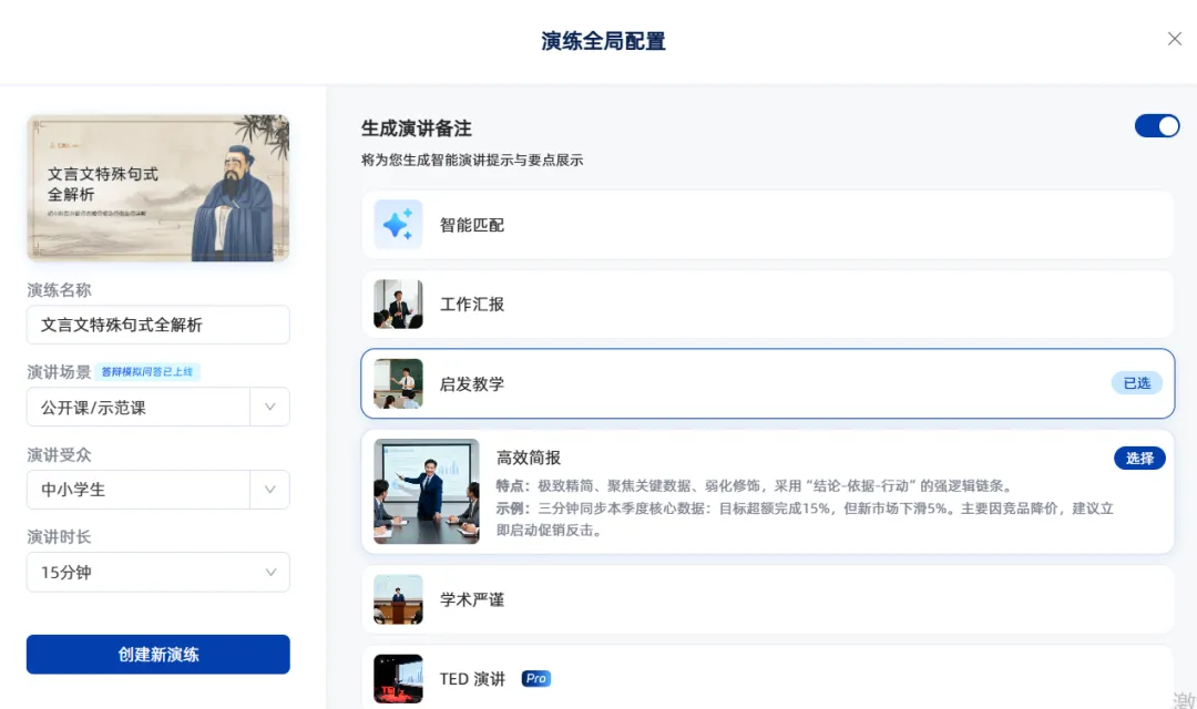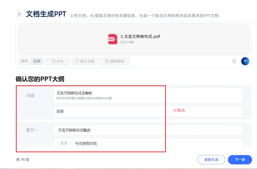 如果手里有现成的文档资料,需要做成PPT形式,可以选择“文档生成”模式,上传文件后,可以对“还原-润色”、语种、页数、排版等方面进行修改。