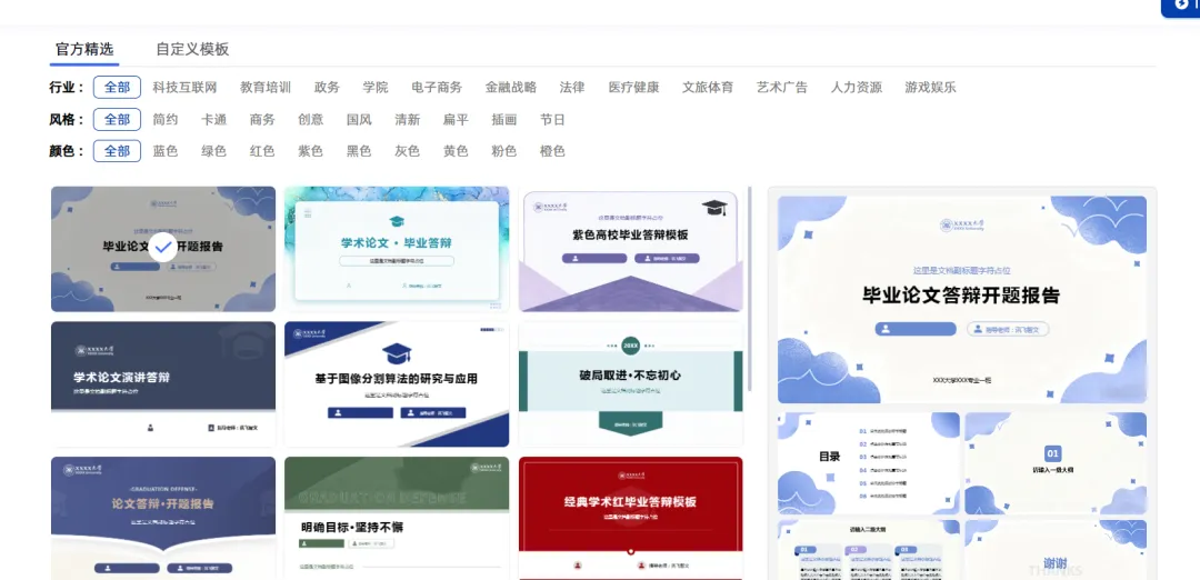 “下一步”之后,可以根据应用场景不同选择相应的PPT样式。
